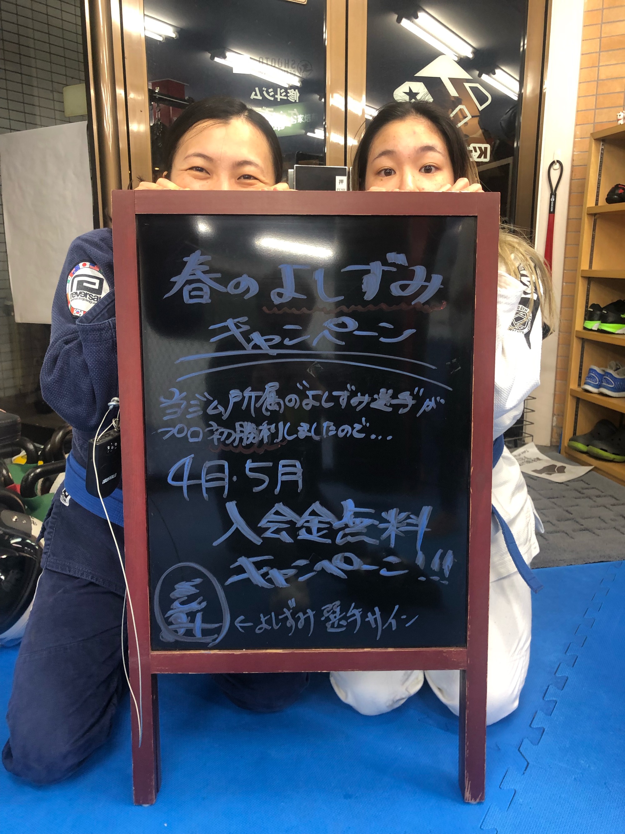春のよしずみキャンペーンのお知らせ 当ジム所属の修斗バンタム級のよしずみ選手が先日の3月24日の修斗ニューピアホール大会においてプロ初勝利をあげることが出来ました。 これまで応援して下さった方々への感謝を込めて、よしずみ選手のプロ初勝利記念キャンペーンを行ないます。4月と5月に入会して下さった方は入会金無料に致します。この機会をお見逃しなく!!